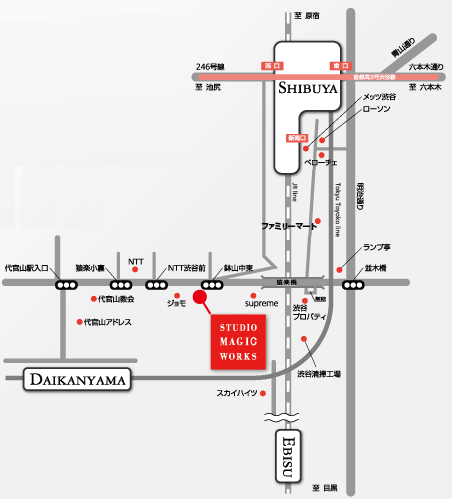 ●JR渋谷駅新南口→エスカレーターを降りて右折、直進→(左手ジョナサン通過)→高架(車道・歩道)下を通過後すぐ左手にある階段を上る→その高架を渡る(JR線上を通過)→高架通過後およそ80m歩く→鉢山中学校東交差点を通過→そこから約10m歩いた左手の茶色いマンション